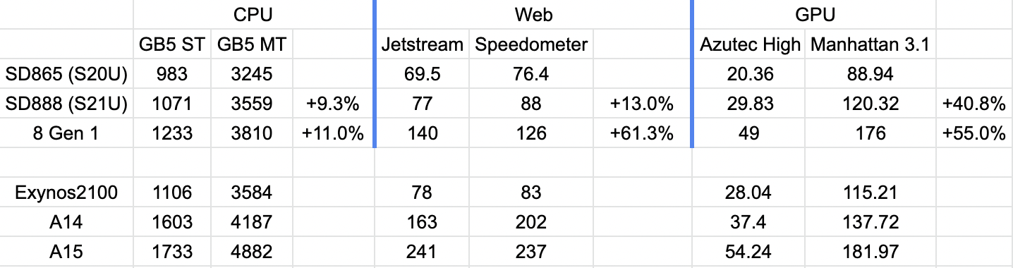 참고로 아래는 갤럭시 탭 S8에 들어간 스냅드래곤 8 1세대 칩과 아이패드 에어에 들어간 A14, 아이패드 미니에 들어간 A15의 성능 비교이다. 갤럭시 탭 S8은 M1은 커녕 A15에도 못 미치는 성능인 것을 확인 할 수 있다.