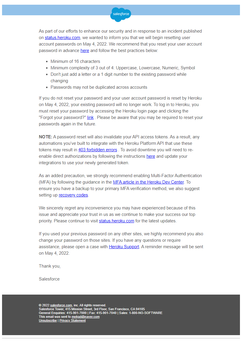 근데 이쯤 되니까 휴가동안 Heroku에서 뭔가 메일이 오긴 왔었던 것이 생각났다..
