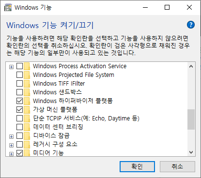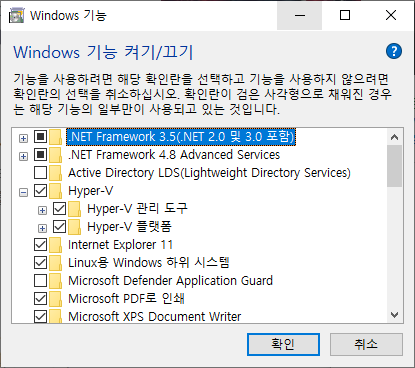 2. 그 후 'Windows 기능 켜기/끄기'에서 아래의 항목들이 체크되어 활성화 되어있는지 확인하자.