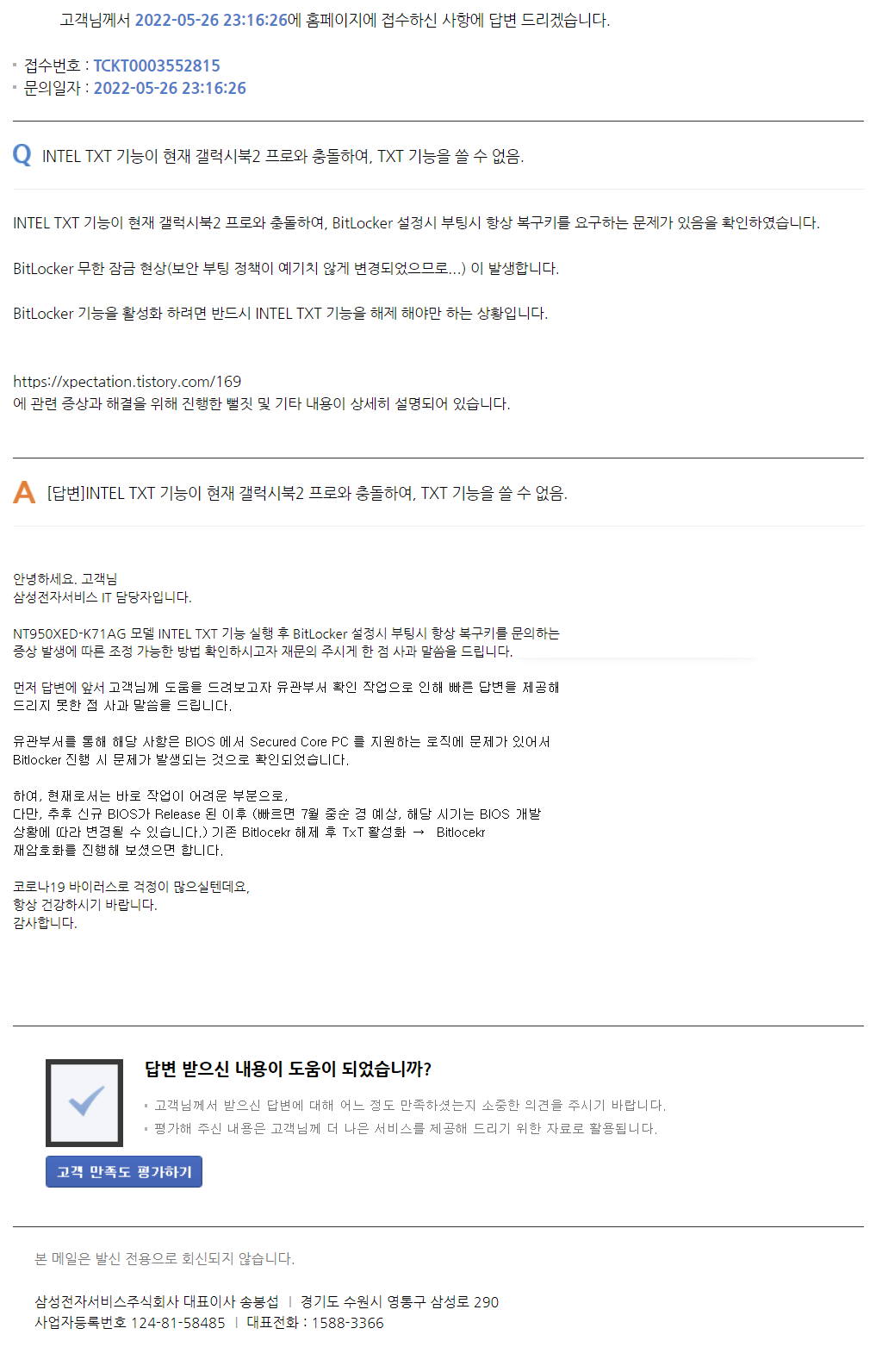 별 내용이 아니라면 아니지만, 어쨌거나 현재 삼성에서 이 문제를 인지하고 있으며 빠른 시일내에 바이오스 지원을 해준다고 했으니 갤럭시북2 프로를 쓰고 있는 분들이라면 BitLocker와 관련하여 삼성을 믿고 기다려보면 좋을 것 같다.