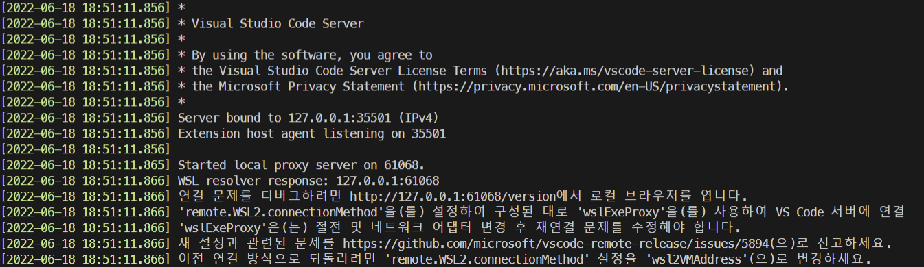 하지만 WSL2가 재시작할때마다 IP값은 매번 달라지는데(유동IP여서 그때 그때 ip를 받아온다고 이해하면 편하다) 이 때문에 시스템이 절전모드에서 깨어나거나 네트워크가 재설정되거나 하는 경우 VSCode의 원격접속이 계속 끊어지는 현상이 발생했고, 0.63.0에서 wslExeProxy 방식이 도입, 0.63.2에서 wslExeProxy가 기본값이 되었다.