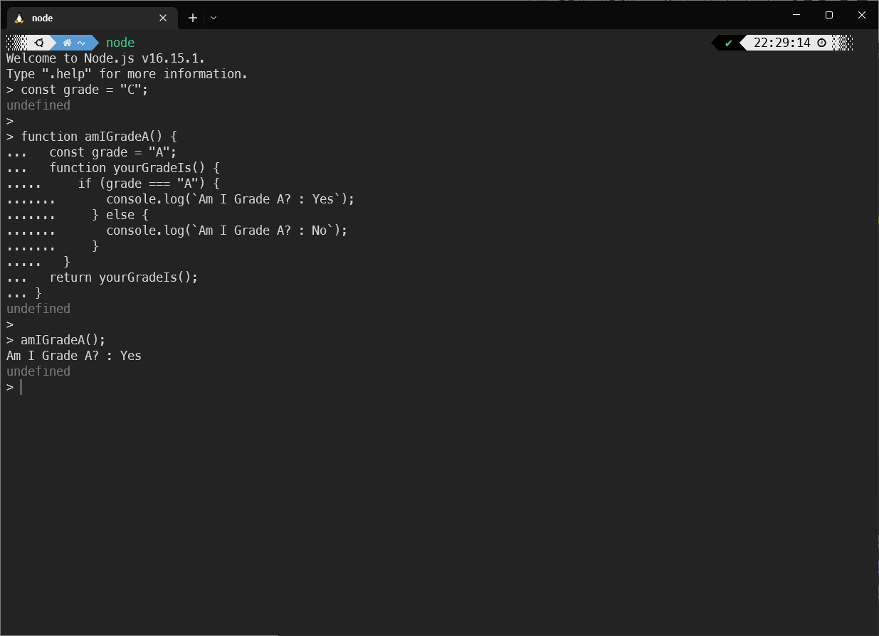 yourGradeIs 함수는 자신이 선언된 위치에서 참조 가능했던 grade 변수(전역 변수로서의 grade가 아닌 amIGradeA 함수 내부의 지역변수 grade를 말한다. 즉 이 grade의 값은 A이다)를 자신의 내부에서 참조하고 있기 때문이다.