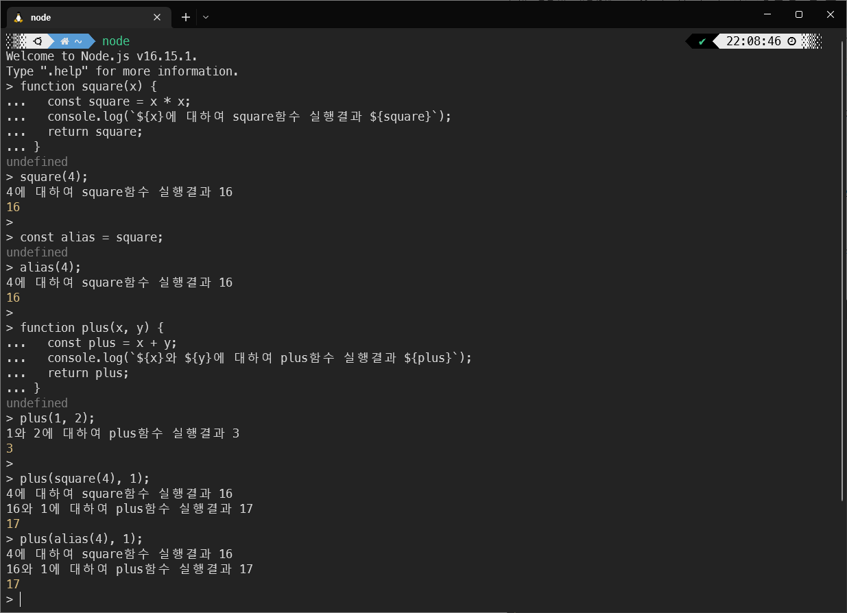 위 코드에서, square 함수는 alias 라는 변수에 할당 되었다. 마치 객체처럼!