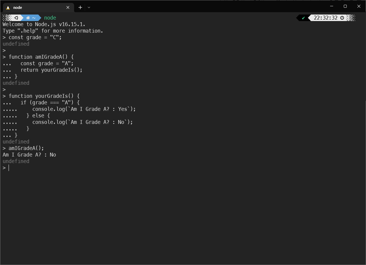 더 이상 yourGradeIs 함수가 amIGradeA 함수 내부에 있지 않다. 따라서 amIGradeA 함수의 렉시컬 스코프 밖에 정의되었기에 amIGradeA 함수의 렉시컬 스코프에 존재하던 grade = "A" 가 아닌, yourGradeIs가 선언된 전역 스코프의 grade = "C"를 참조하고 있다.