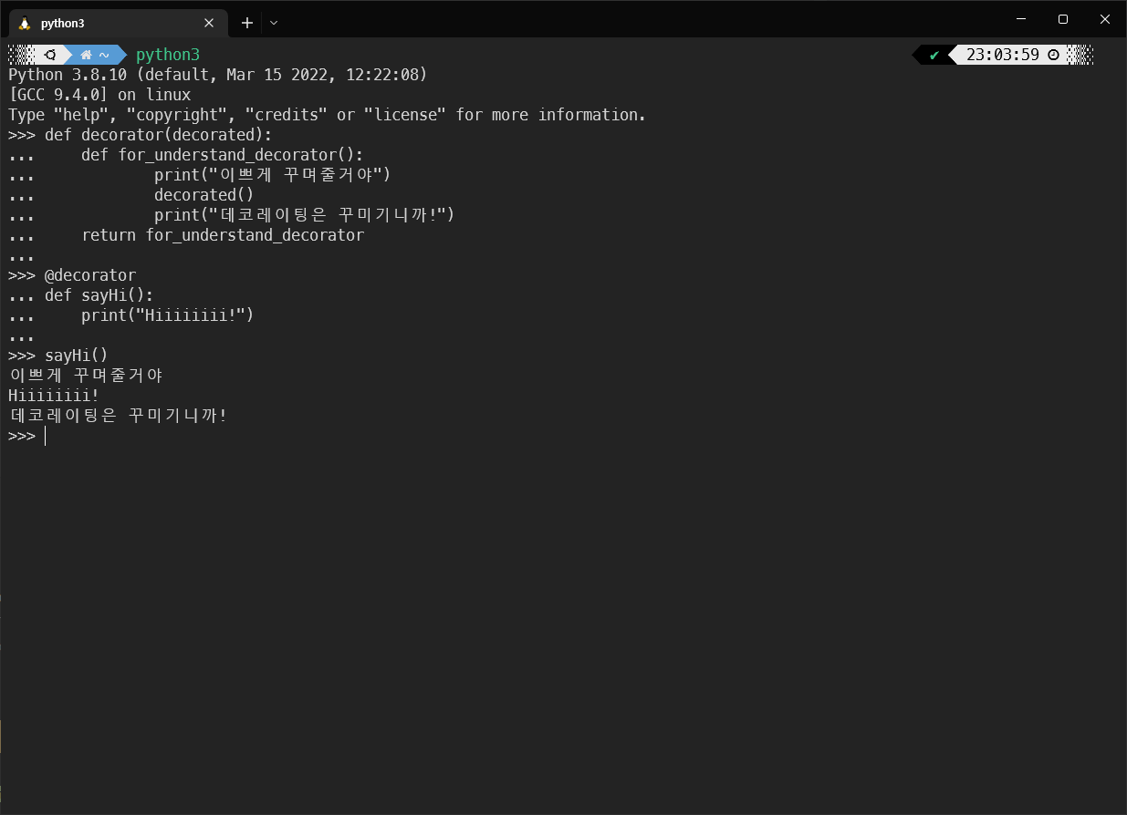 위 코드에서 sayHi 함수의 앞뒤로 새로운 내용이 print 된 것을 볼 수 있다.