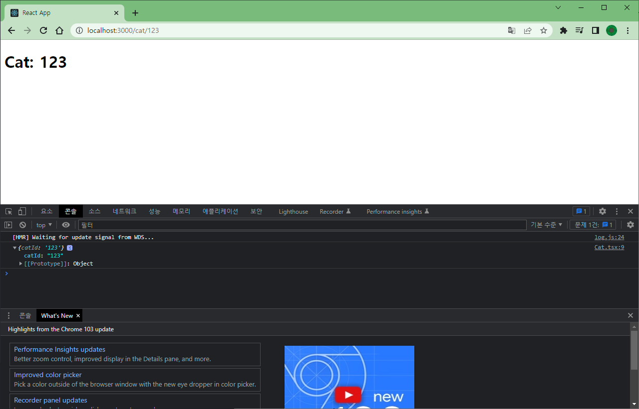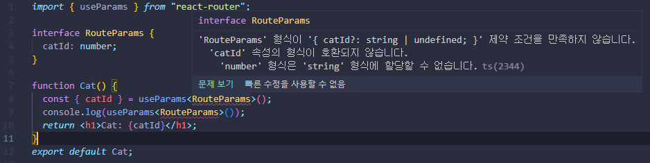 useParams()를 통해, Route 컴포넌트에서 path에 정의된 catId의 실제 req.param값을 Object로 받아올 수 있다.