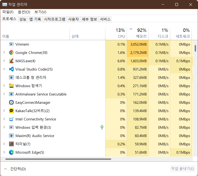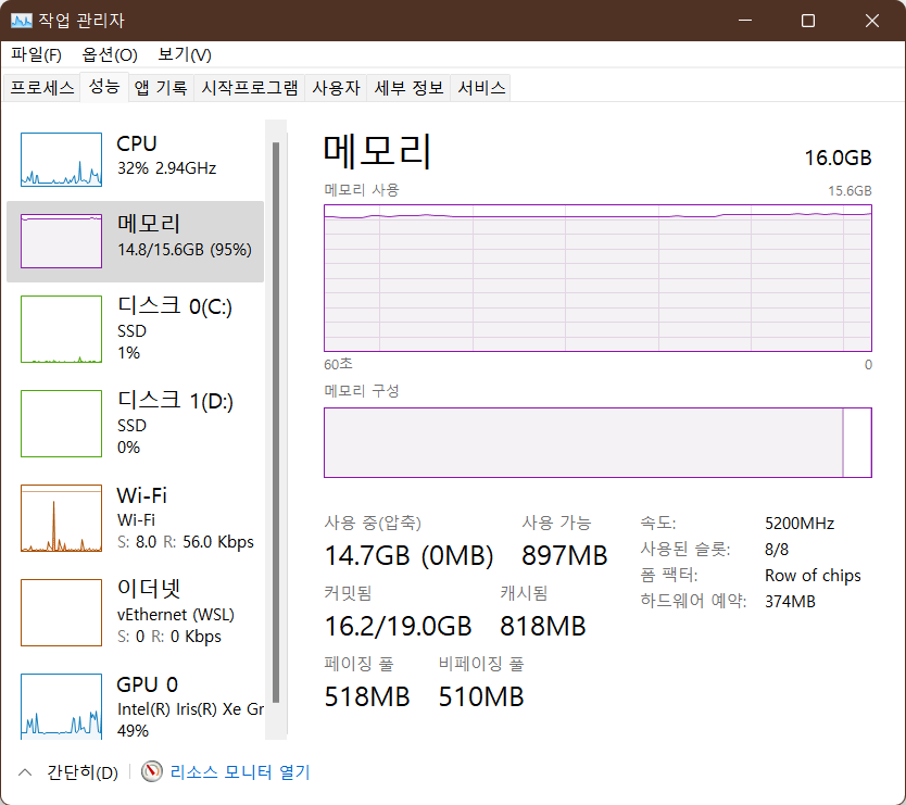 근데 가상머신은 RAM을 정말 많이 잡아먹는다. 게다가 최근 브라우저들은 심심하면 램을 1GB씩 잡아먹고 있는 모습을 볼 수 있다. 그래서 WSL에서 VS Code 하나 돌리면서 크롬 몇 개 띄워서 이것 저것 검색해보면 이미 램은 60~80% 찍히고 있다. 거기에 게임이라던가 다른 프로그램을 하나 얹어주면 램 90% 달성, 참 쉽죠?