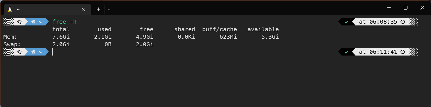 작업 관리자에 표시되는 Vmmem 프로세스가 아마도 VmMemory를 뜻하는 것 같은데, 이 프로세스가 WSL2의 전부는 아니다. WSL2에서 잡아먹고 있는 램은 아래 명령어를 통해 확인 가능하다.