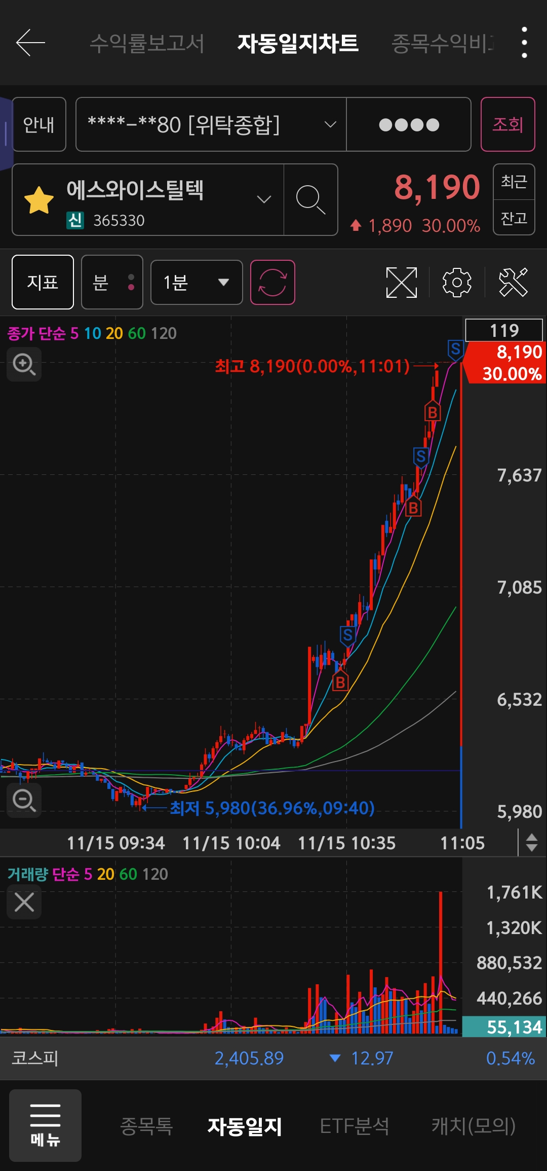 나는 HTS로는 호가창과 차트 2개를 동시에 보면서 매매하는 편인데 MTS라 주문창만 볼 수 있어서 그냥 짧게 짧게 안전한 구간에서 끊어 먹었다.